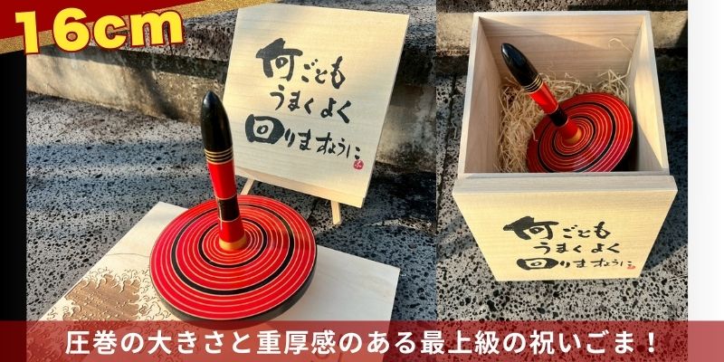 16cm:材料を厳選して製作。圧巻の大きさと重厚感のある最上級の祝いごま。