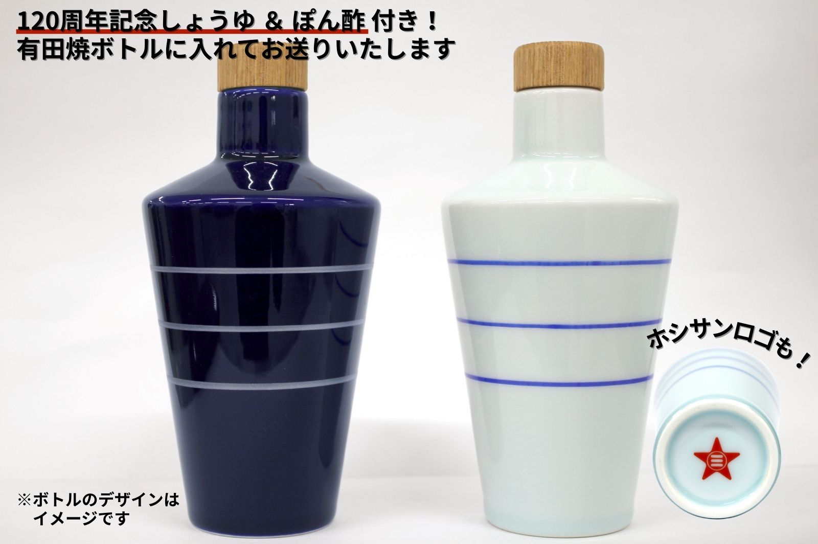 今回のために制作した限定の有田焼ボトルに、創業120周年を記念して誕生した新商品【しょうゆ・ぽん酢】を詰め合わせた特別なセット