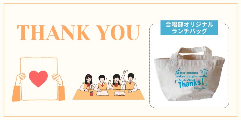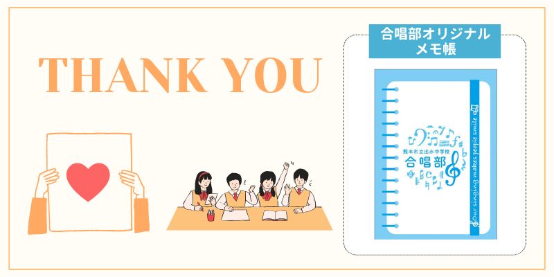 3月29日(日)開催の出水中学校合唱部の春コンサート(詳細はこちら)当日に配布するチラシへ「個人または企業様のお名前」を掲載いたします。そして、お名前掲載と合わせて、下記3つの返礼もお届けいたします。・部員からのお礼のお手紙