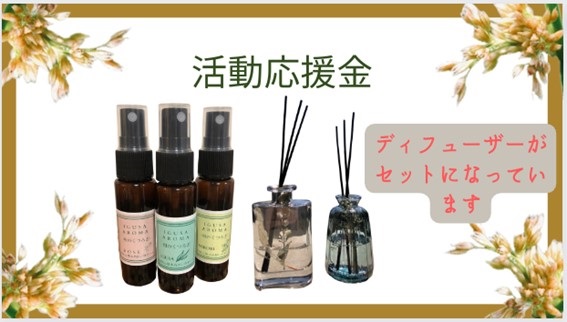 今回は、申込み欄の「活動支援金」にお申し込みいただくと、「IGUSA AROMA 和のくつろぎ」のい草オリジナルの香りと、ローズ・ネロリの香りをそれぞれブレンドさせた計3種類のアロマをお届けいたします!(※活動支援金は今後の研究、活動に役立てられます)