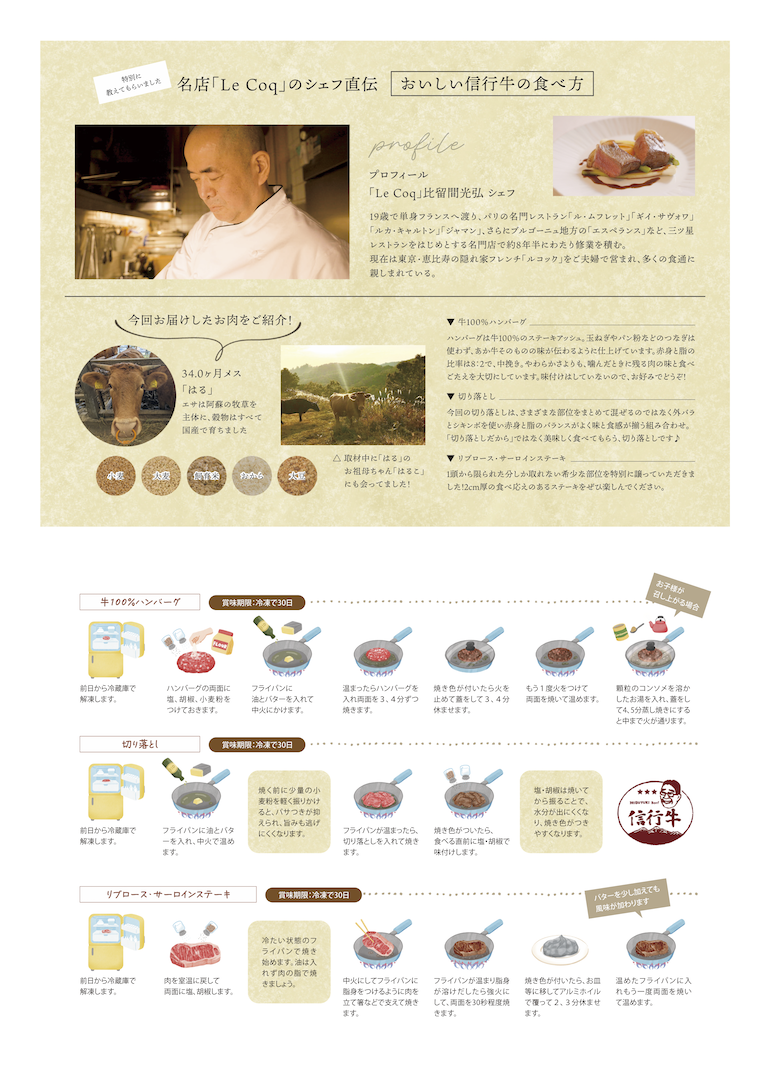 返礼品コースには当初予定していなかった「信行牛の焼き方レシピ」も急遽作成しました。