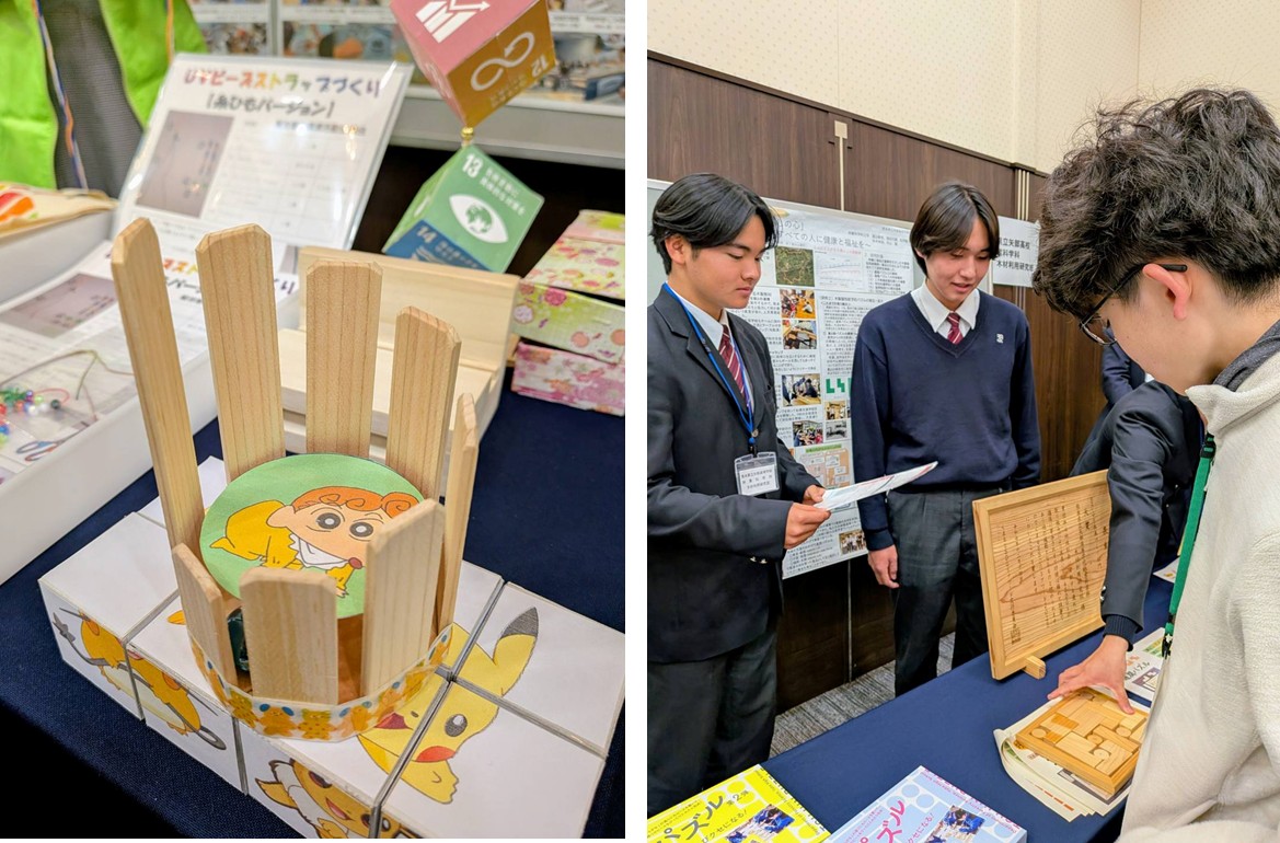 未来づくり部門で大賞を受賞した、熊本県立矢部高等学校林業科学科 木材利用研究室の先生と学生とは、通潤パズルという認知症予防パズルについて意見を交換しました。視覚障がいの方向けに改良できないか。今後も協議を続ける予定です。