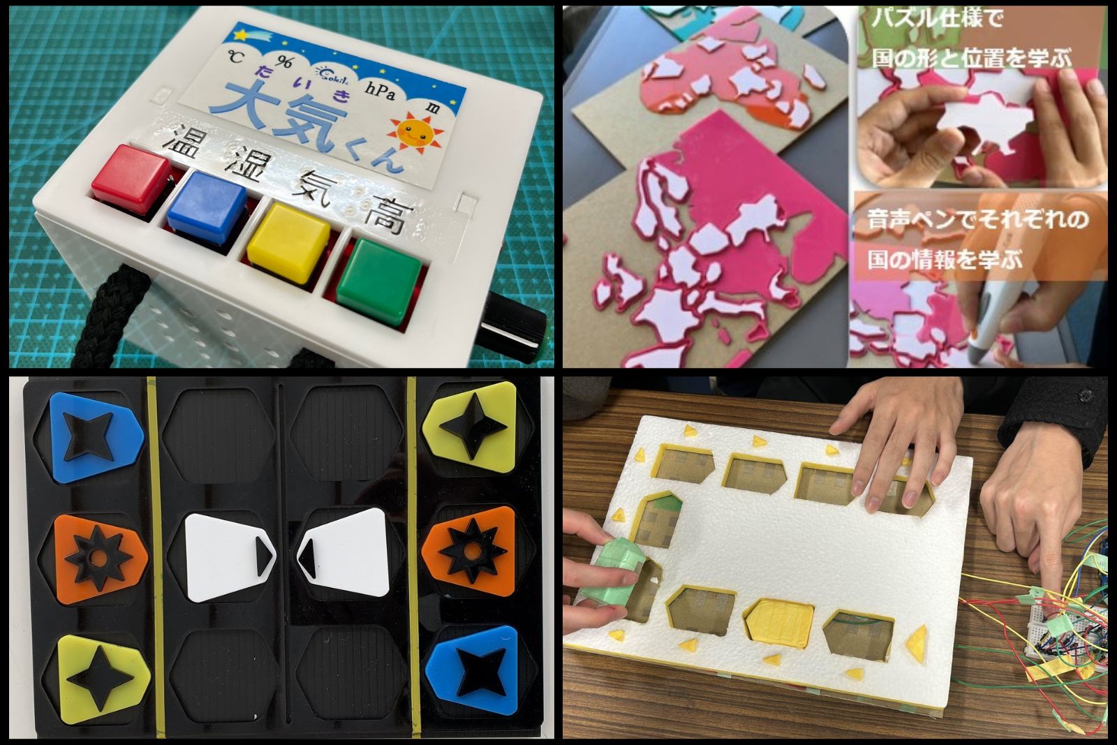 はめ込む土台と、国のピースの両方にペンで触れると、音声で地名や情報を確認できるシールがついています。地理学習に役立つことを想定しており、有用性検証を進行中です。