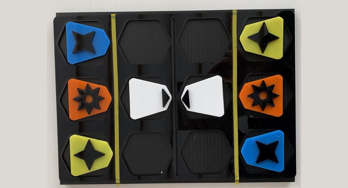 駒には凹凸のある大きなマークが付けられており、手触りで駒の種類や進む方向が判別できるようになっています。